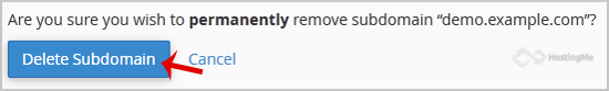 5. You will receive a warning that you are removing a "subdomain.example.com". You will need to click on the "Delete Subdomain" button to remove your subdomain permanently.