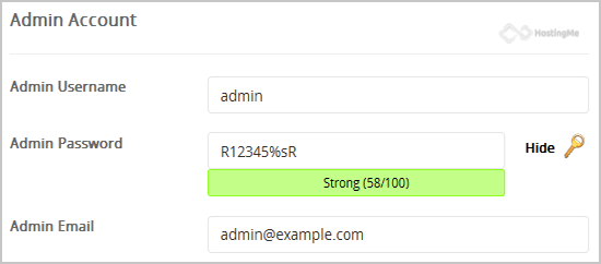 7. Under the "Admin Account" field enter the following information: