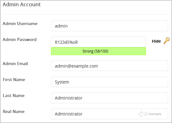 7. Under the "Admin Account" field enter the following information: