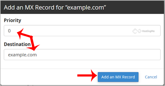 3. Click on the "MX Record" and a small window will open. Enter the required details in it.