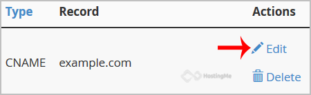 4. Locate CNAME Record you wish to edit or remove. Should you wish to edit a CNAME record, click the “Edit†option, modify the details and then click on “Save Recordâ€. Removing a record can be done with the “Delete†option.